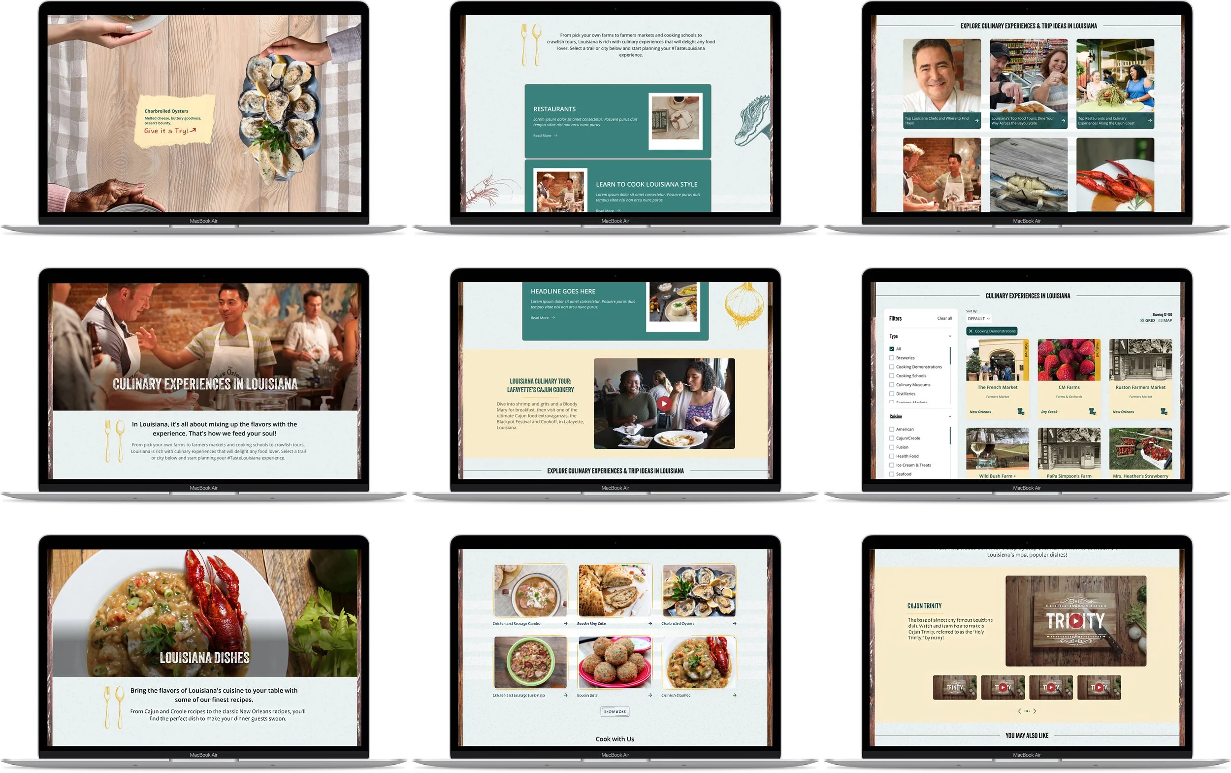 The Louisiana's Culinary Trails website aims to promote tourism by showcasing the state's rich culinary heritage. In preparation for "The Year of Food," the client sought a complete overhaul of the existing site to align with the successful tone and aesthetic of the previously designed Louisiana Libations website.